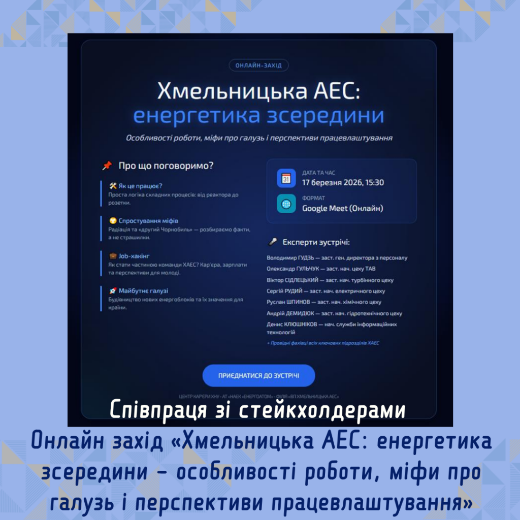 - Співпраця зі стейкхолдерами. Онлайн захід «Хмельницька АЕС: енергетика зсередини – особливості роботи, міфи про галузь і перспективи працевлаштування»17 березня 2026 року здобувачі першого (бакалаврського) рівня вищої освіти спеціальності «Менеджмент» в процесі вивчення… Читати далі »Співпраця зі стейкхолдерами. Онлайн захід «Хмельницька АЕС: енергетика зсередини – особливості роботи, міфи про галузь і перспективи працевлаштування»