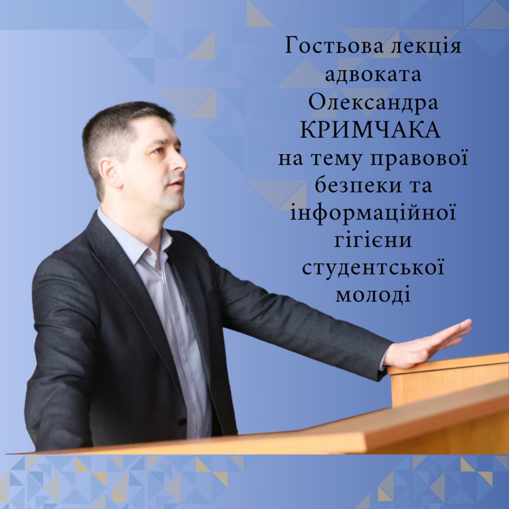 - Гостьова лекція адвоката Олександра КРИМЧАКА на тему правової безпеки та інформаційної гігієни студентської молоді📅 10 березня 2026 року за ініціативи д-ра екон. наук, професора Євгенія РУДНІЧЕНКА для здобувачів… Читати далі »Гостьова лекція адвоката Олександра КРИМЧАКА на тему правової безпеки та інформаційної гігієни студентської молоді