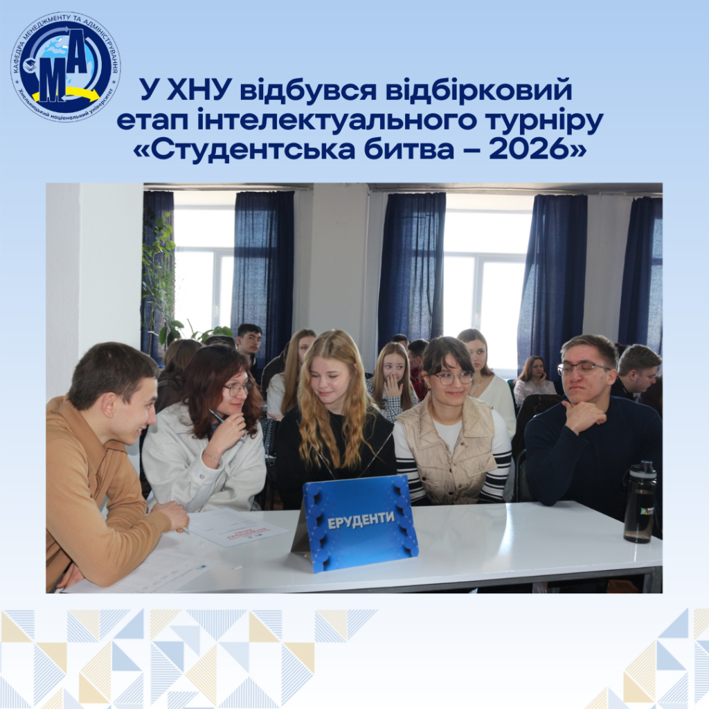 - У ХНУ відбувся відбірковий етап інтелектуального турніру «Студентська битва – 2026»12 березня 2026 року у Хмельницькому національному університеті відбувся відбірковий етап інтелектуального турніру «Студентська битва… Читати далі »У ХНУ відбувся відбірковий етап інтелектуального турніру «Студентська битва – 2026»