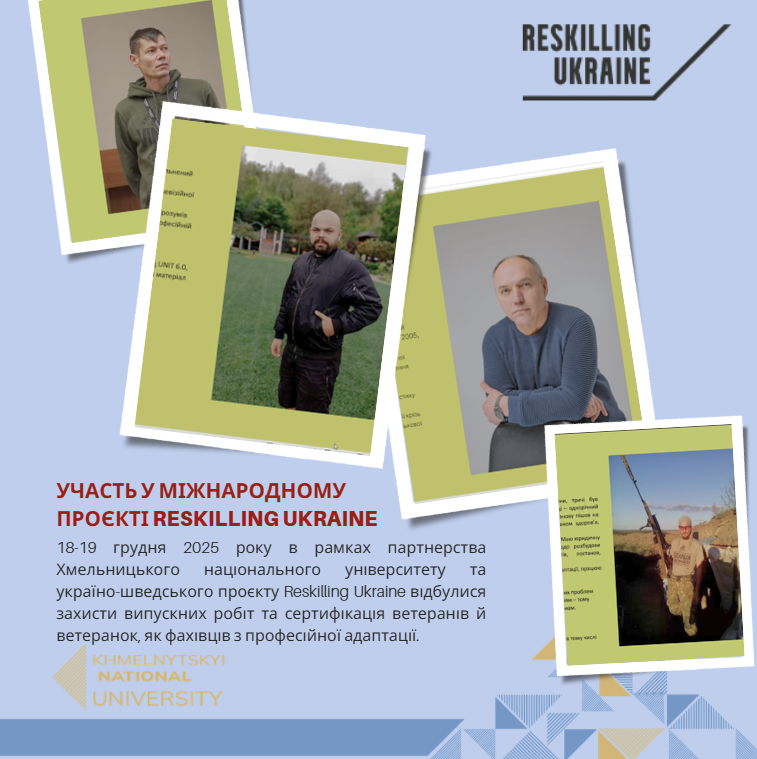 - УЧАСТЬ У МІЖНАРОДНОМУ ПРОЄКТІ RESKILLING UKRAINE18-19 грудня 2025 року в рамках партнерства Хмельницького національного університету та україно-шведського проєкту Reskilling Ukraine… Читати далі »УЧАСТЬ У МІЖНАРОДНОМУ ПРОЄКТІ RESKILLING UKRAINE