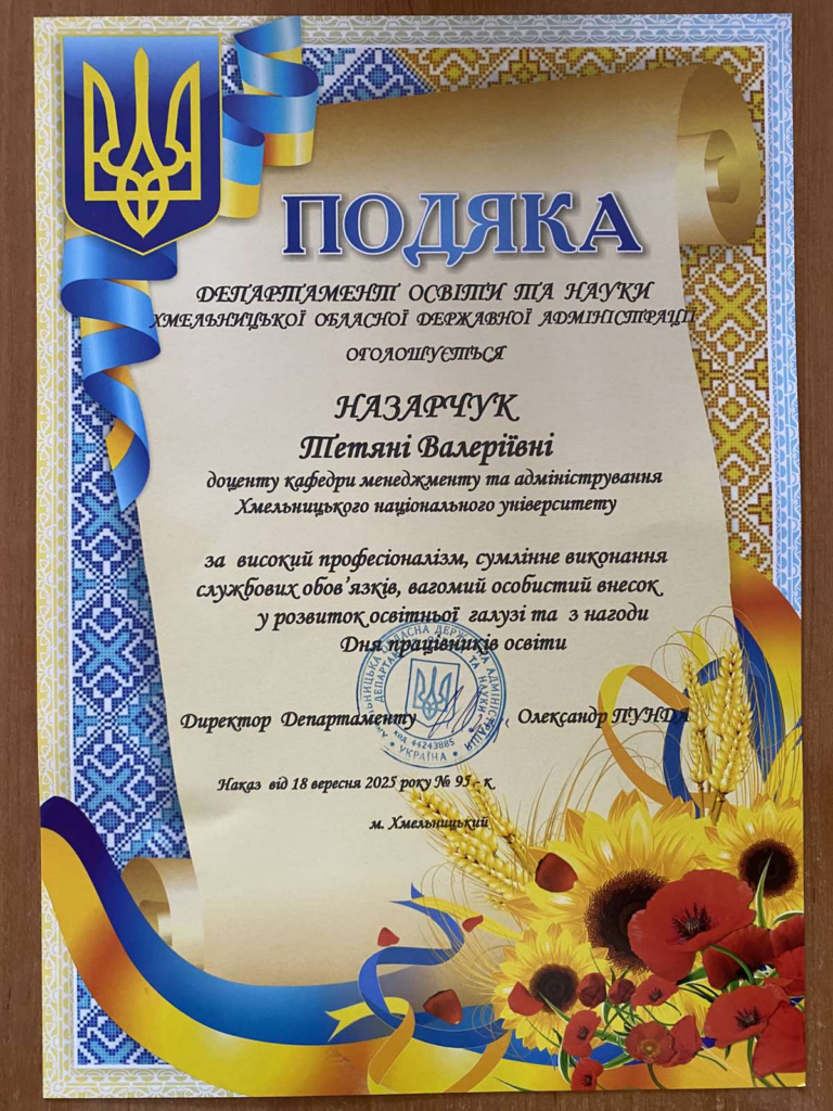 Вітаємо Тетяну Валеріївну Назарчук, доцента кафедри менеджменту та адміністрування Хмельницького національного університету, з отриманням Подяки Департаменту освіти і науки Хмельницької ОДА.