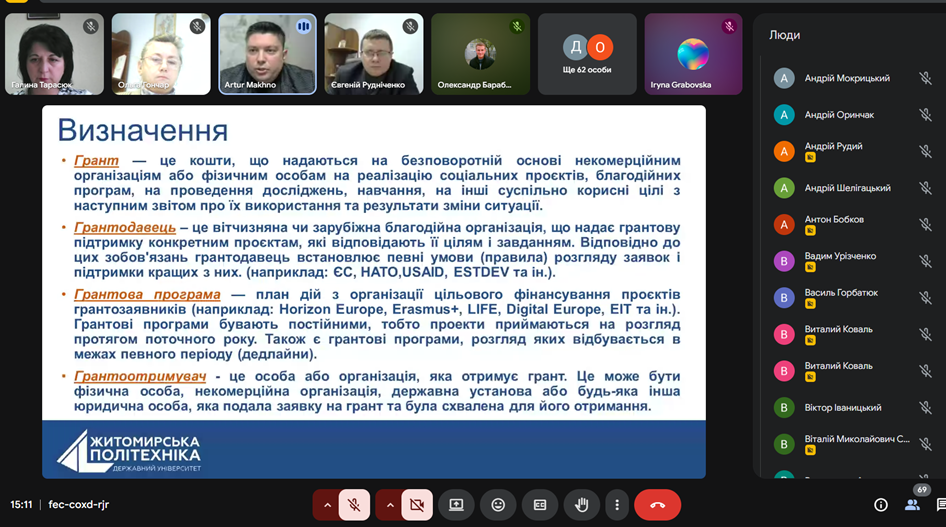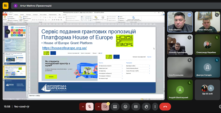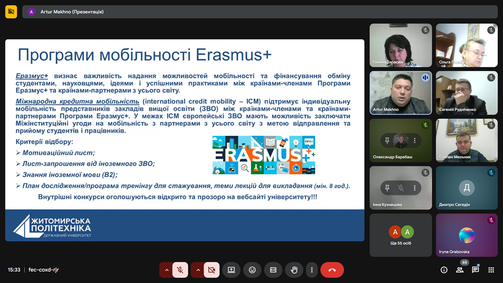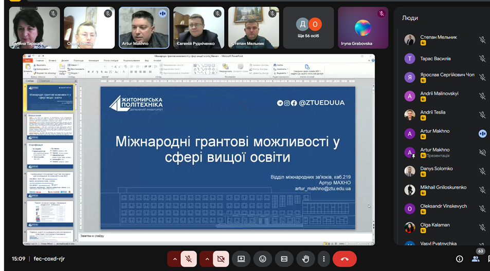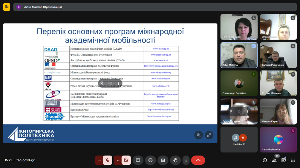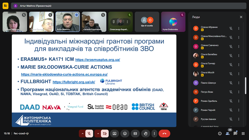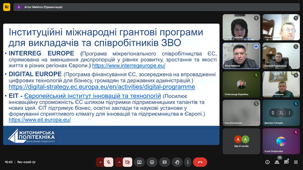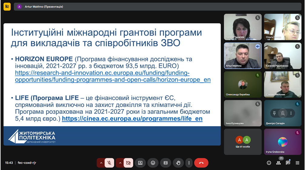 Запрошений спікер Артур МАХНО, заступник керівника відділу міжнародних зв’язків Державного університету «Житомирська політехніка», представив змістовну презентацію «Міжнародні грантові можливості у сфері вищої освіти».