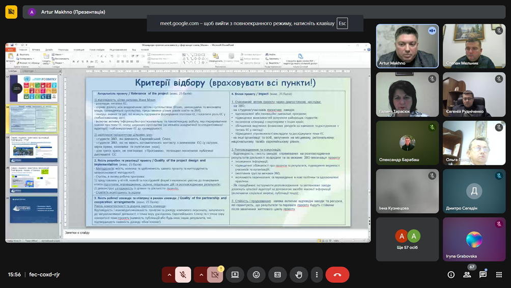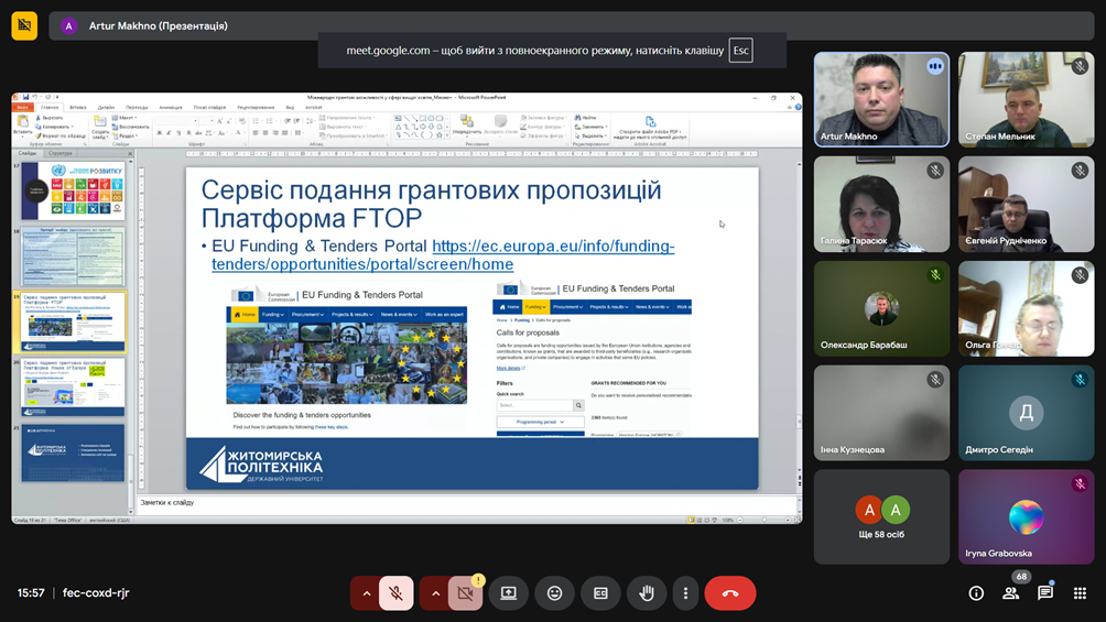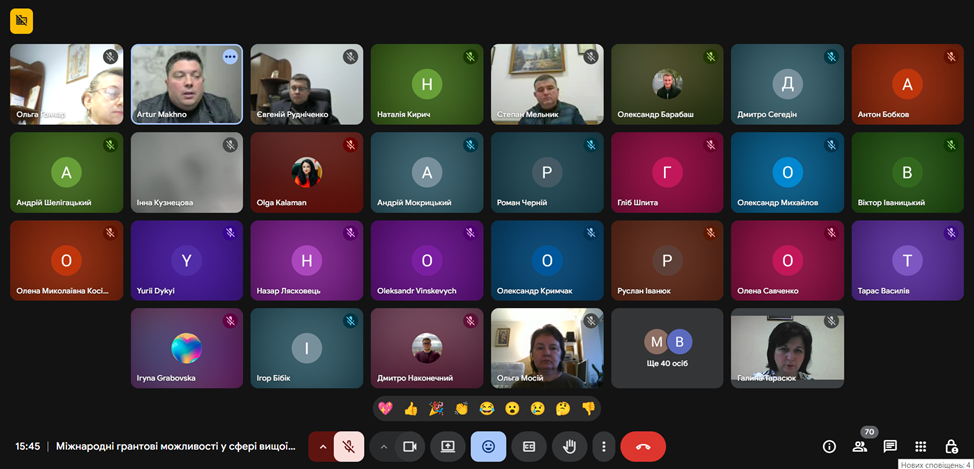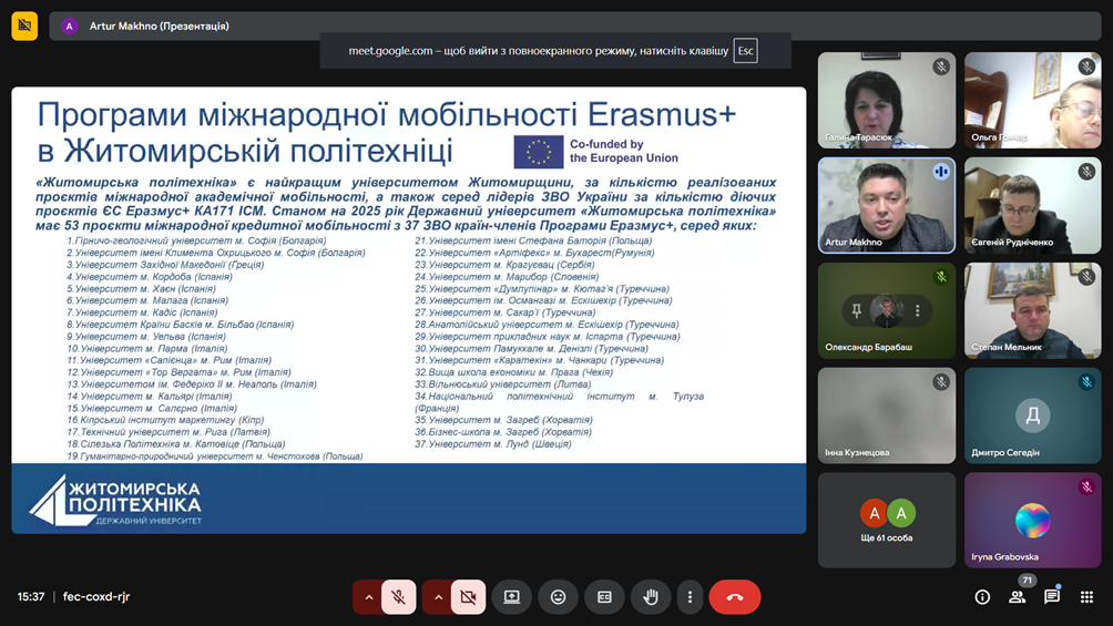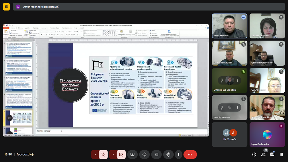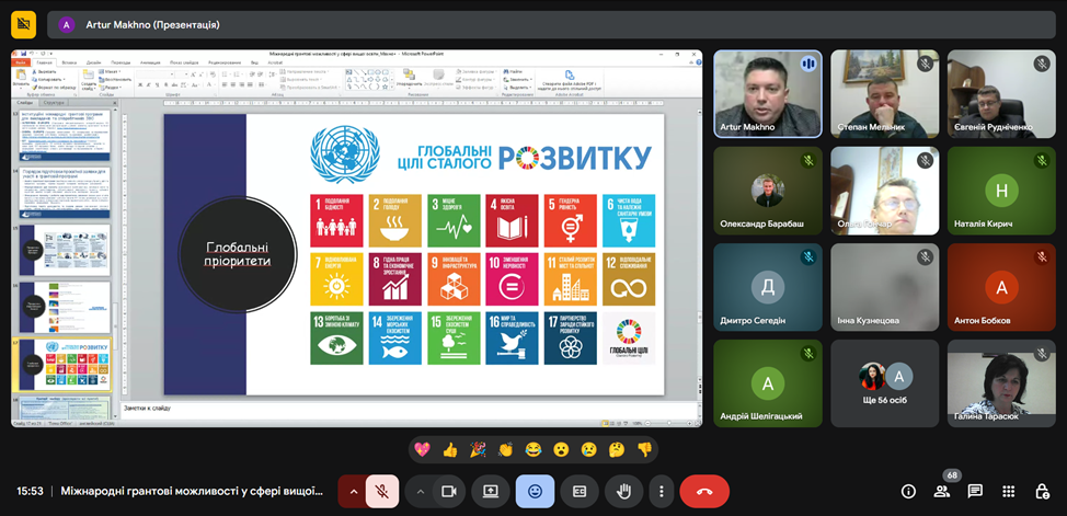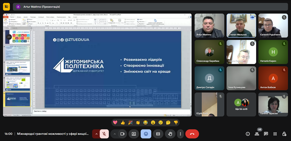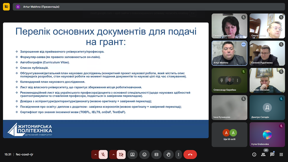 Запрошений спікер Артур МАХНО, заступник керівника відділу міжнародних зв’язків Державного університету «Житомирська політехніка», представив змістовну презентацію «Міжнародні грантові можливості у сфері вищої освіти».