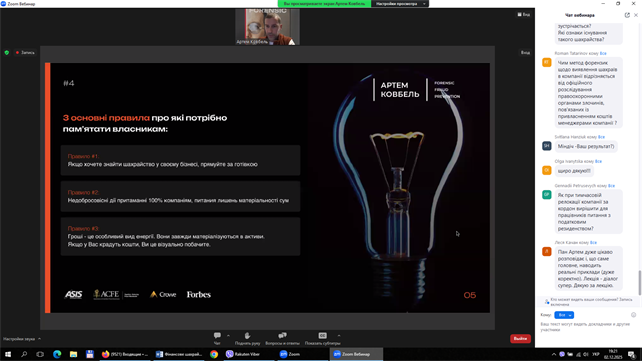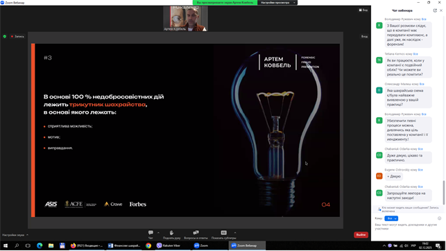 Під час вебінару студенти дізналися, що форензік (forensic auditing) — це не просто перевірка, а спеціалізоване фінансове розслідування. На відміну від класичного аудиту, який підтверджує правильність звітності, форензік спрямований на пошук прихованих фактів шахрайства, корупції та конфліктів інтересів.