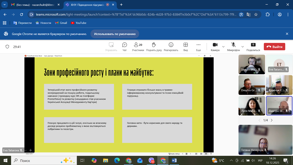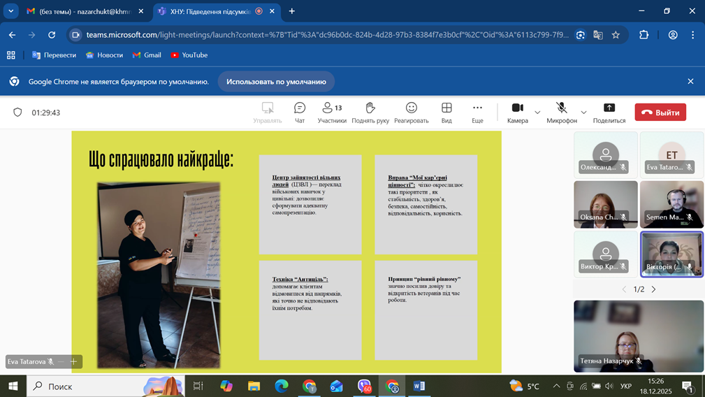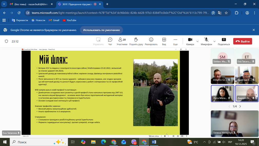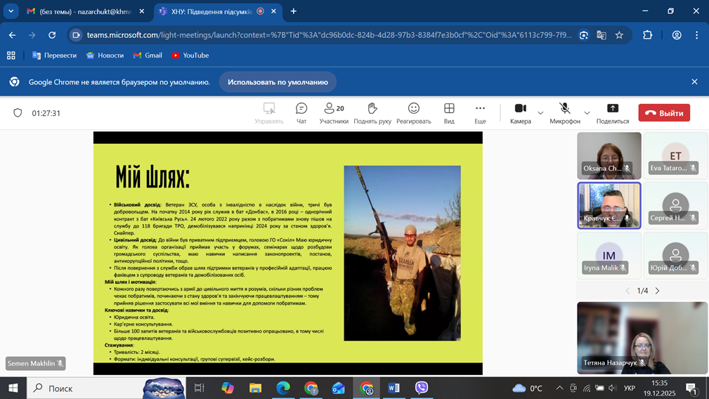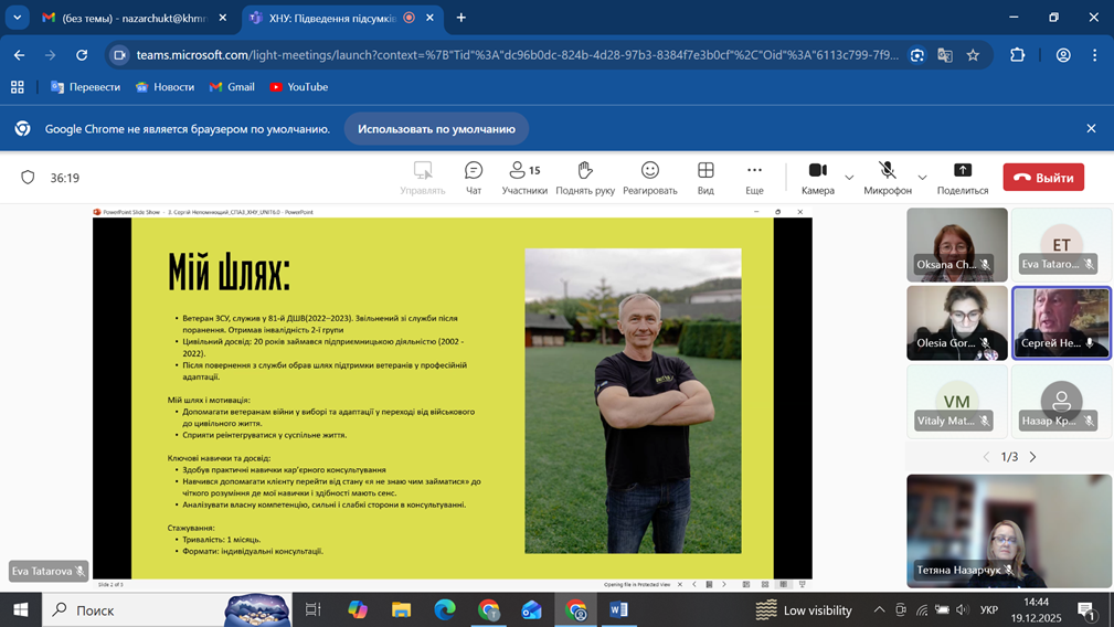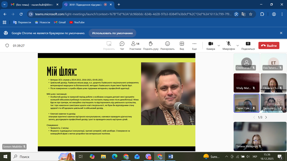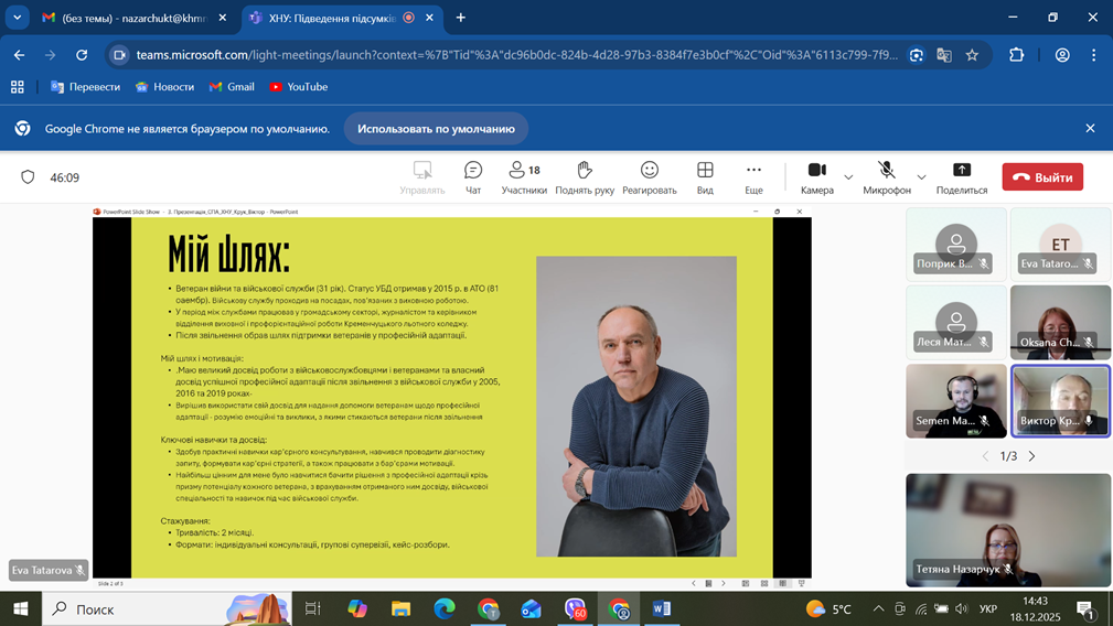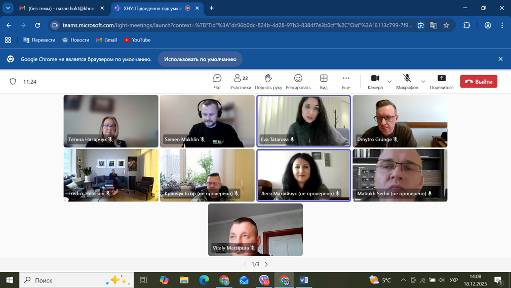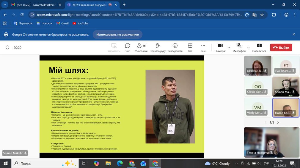 18-19 грудня 2025 року в рамках партнерства Хмельницького національного університету та україно-шведського проєкту Reskilling Ukraine відбулися захисти випускних робіт та сертифікація ветеранів й ветеранок, як фахівців з професійної адаптації.