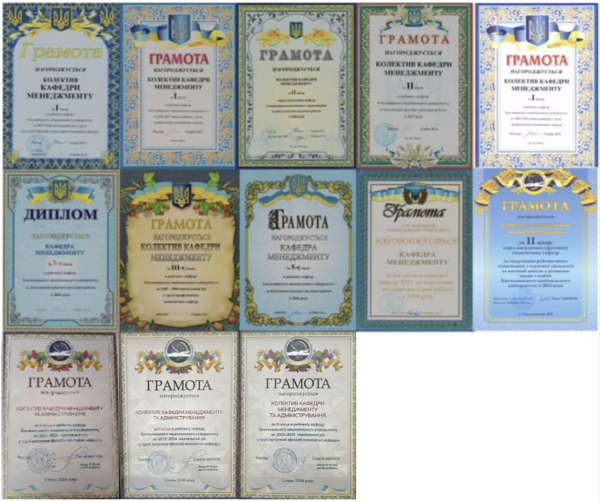 Результати науково-дослідної роботи кафедри не залишились непоміченими і з боку керівництва університету – упродовж останніх років колектив кафедри неодноразово нагороджувався грамотами за призові місця в рейтингу кафедр Хмельницького національного університету.